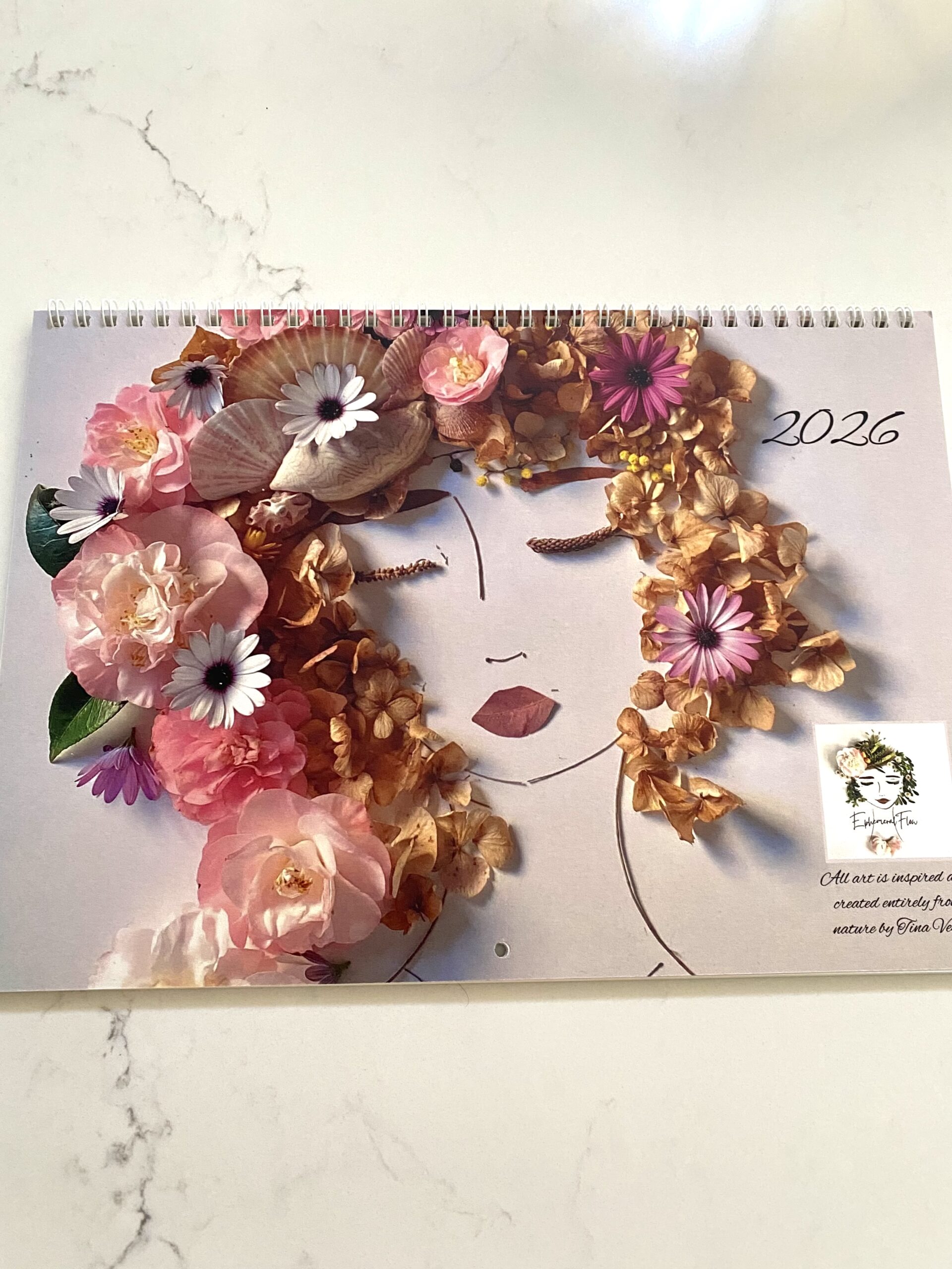 I create botanical art from flowers & foliage I gather on my walks and from my garden, nothing is drawn, painted or glued down, it is all made entirely from elements of nature and balances very delicately. I have to work very quickly to create each piece before the flowers and petals wilt, once finished I take a photo of the finished piece and then recycle the elements back into my garden or save some for future creations. This is a print of my artistic designs and is A4 size with large spaces to write in appointments